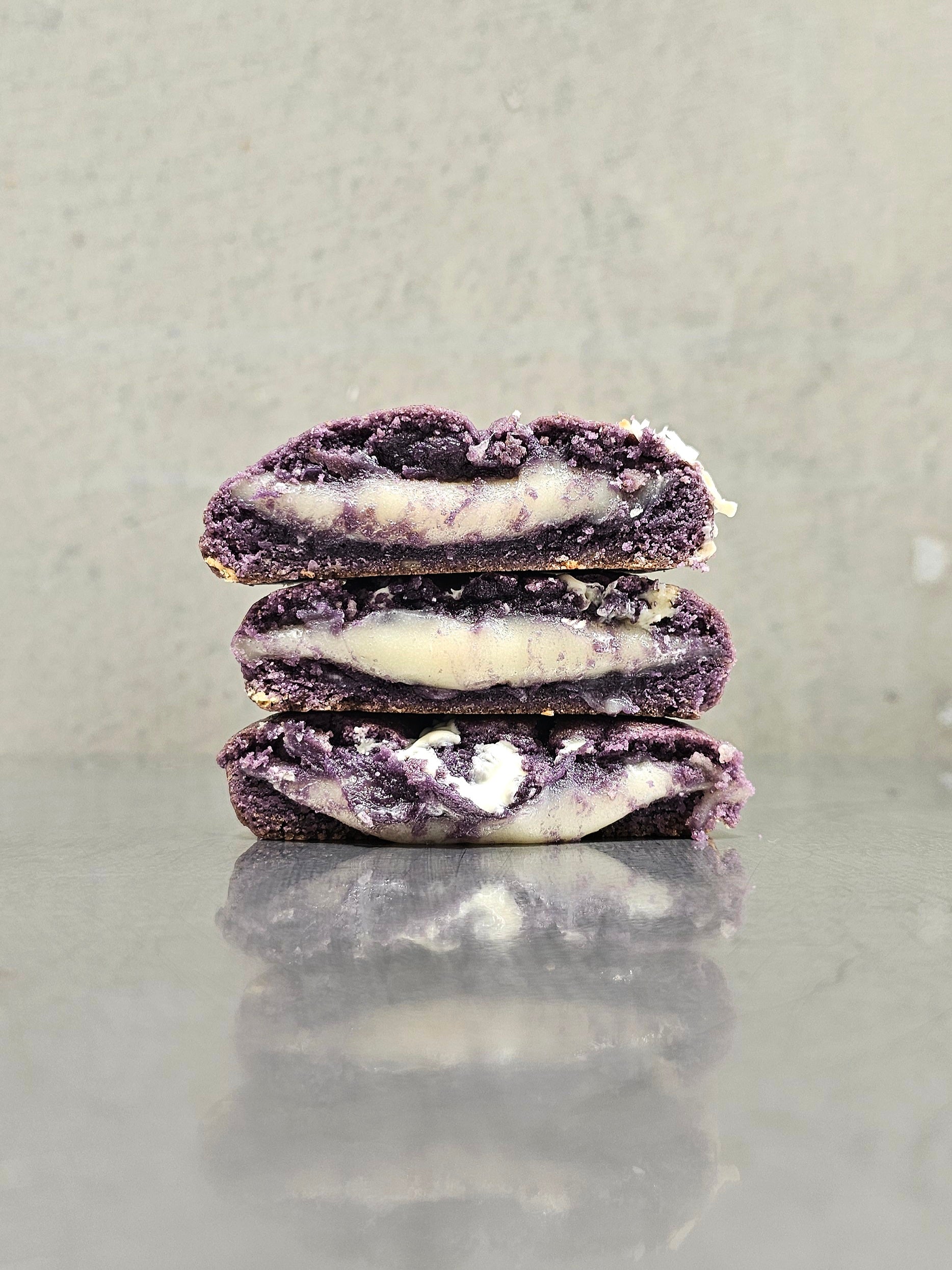 Indulge in a delectable treat with our Ube Mochi! This unique cookie features a chunk of ube, a vibrant purple yam known for its earthy sweet flavour, surrounded by a chewy mochi filling. The perfect blend of textures and flavours for a truly satisfying snack.