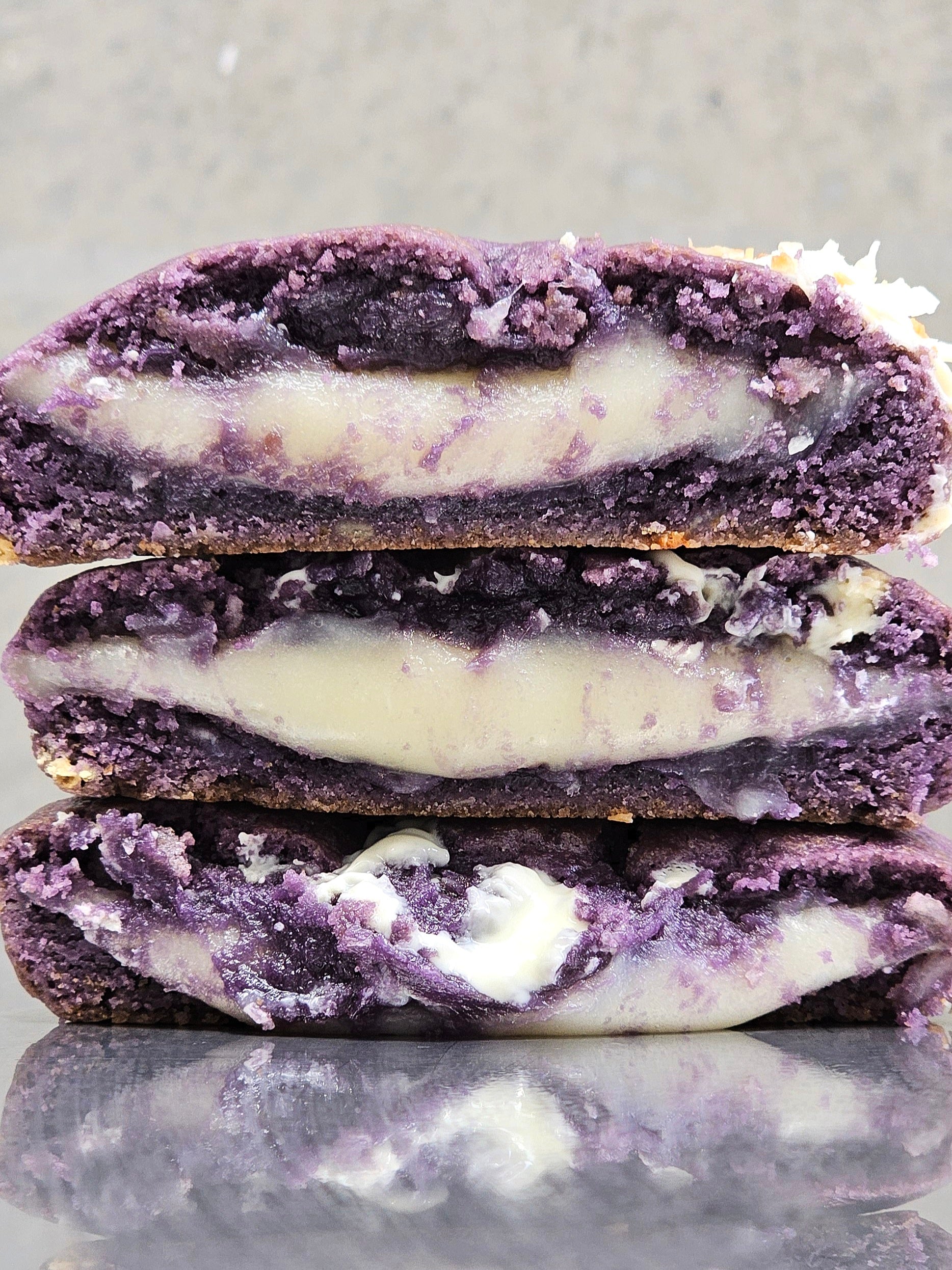 Ingredients: Belgium White chocolate chips, plain flour, Cake flour, caster sugar, brown sugar, unsalted butter, eggs, salt, Raising Agents, Vanilla extract, Ube extract, Sweet Ube paste, toasted coconut.